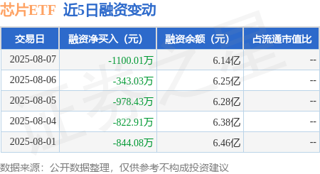本站消息,8月7日,芯片ETF(159995)融资买入8514.51万元,融资偿还9614.52万元,融资净卖出1100.01万元,融资余额6.14亿元。